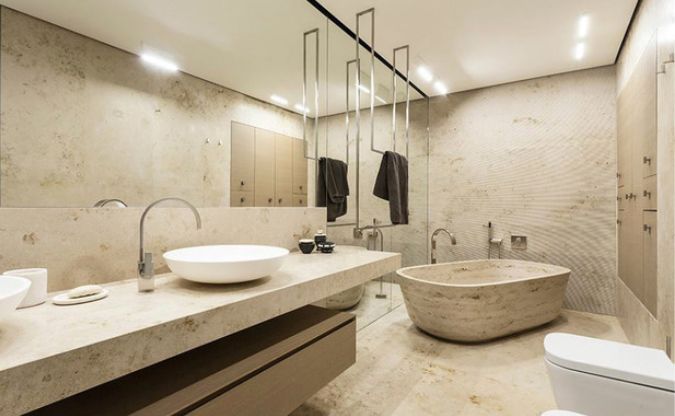 Batu alami dapat digunakan di lantai maupun dinding kamar mandi. Dengan banyaknya pilihan batu alami yang ada, Anda bisa menggabungkan beberapa jenis. Namun, untuk kamar mandi yang sering terkena air, sebaiknya hindari penggunaan batu alami yang mudah menyerap air.